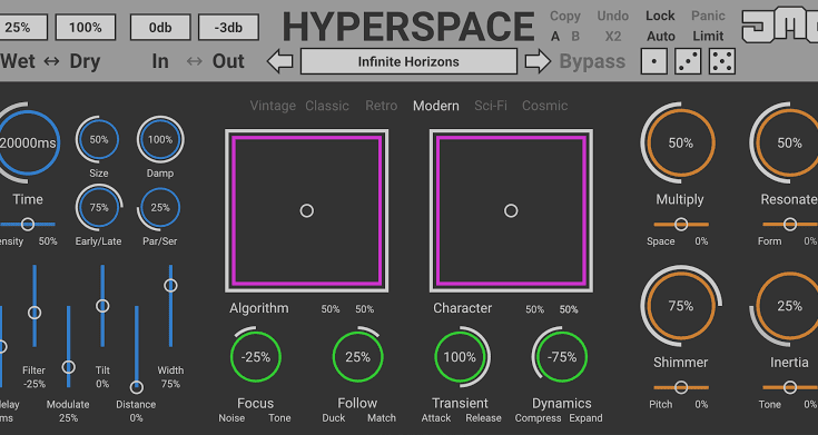 HyperSpace is an algorithmic reverb that allows the user to create algorithms consisting of various processors. The modes “Vintage”, “Classic”, “Retro”, “Modern”, “Sci-Fi” and “Space” allow you to combine various algorithms with endless possibilities. HyperSpace enriches your tracks with many colors.