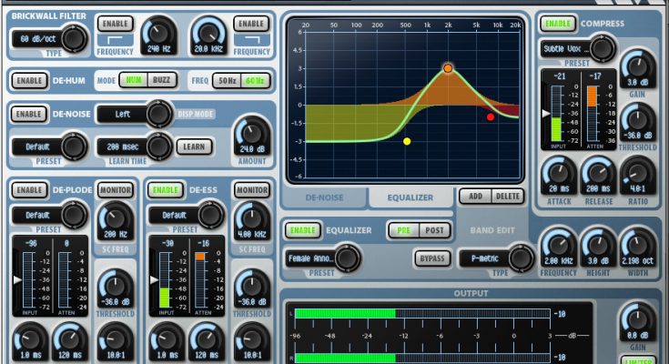 Dialog brings together in one plug-in all the processing needed to clean up, correct and improve the recording of spoken language. It is ideal for film / TV scoring or broadcasting. Dialog includes hard-clipping filters, de-hum and de-buzz processing, wideband noise reduction, de-esser, 10 band equalizer, compressor and limiter. Separate presets for each category let you get things done quickly.