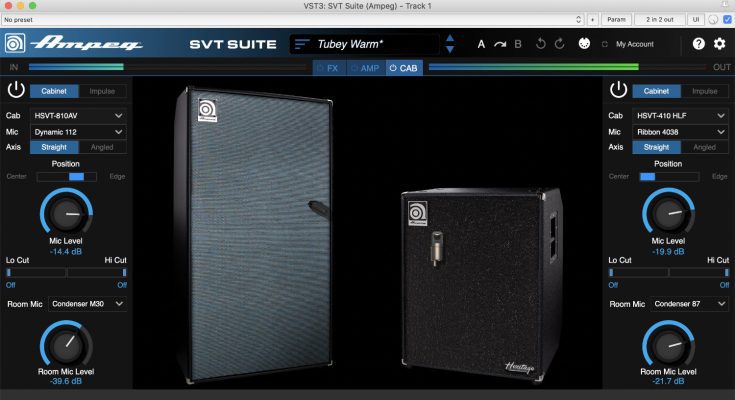 The cabinets can be connected to any of the six virtual microphones, and you can adjust the position between the microphones and the booths, as well as mix one of the three fixed room microphones. There are also models with five Ampeg effects pedals, including the new RocktaverTM and PhasifierTM effects. All of this is topped off with one extremely powerful bass booster plug-in, offering almost unlimited variations on the authentic Ampeg SVT tone.