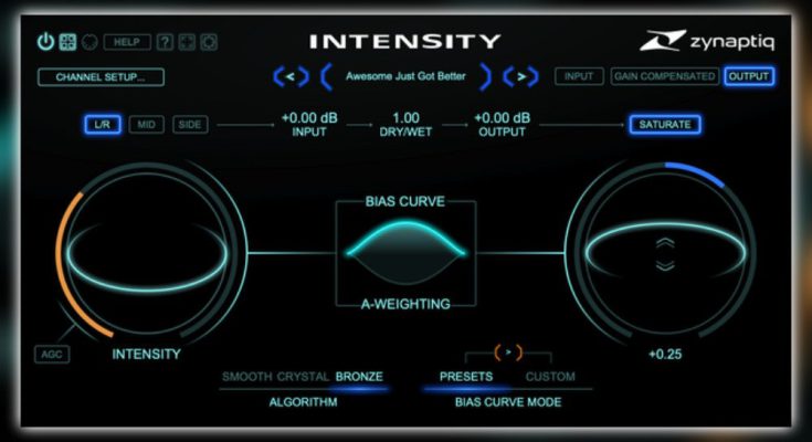 The unique algorithm highlights important features of the signal – making sounds more similar to each other – and is controlled, in essence, by a single control. Thanks to a patented algorithm and an additional soft-knee saturation limiter in the plugin’s output stage, INTENSITY also does a great job of achieving maximum volume and creating a beautifully aggressive sound.